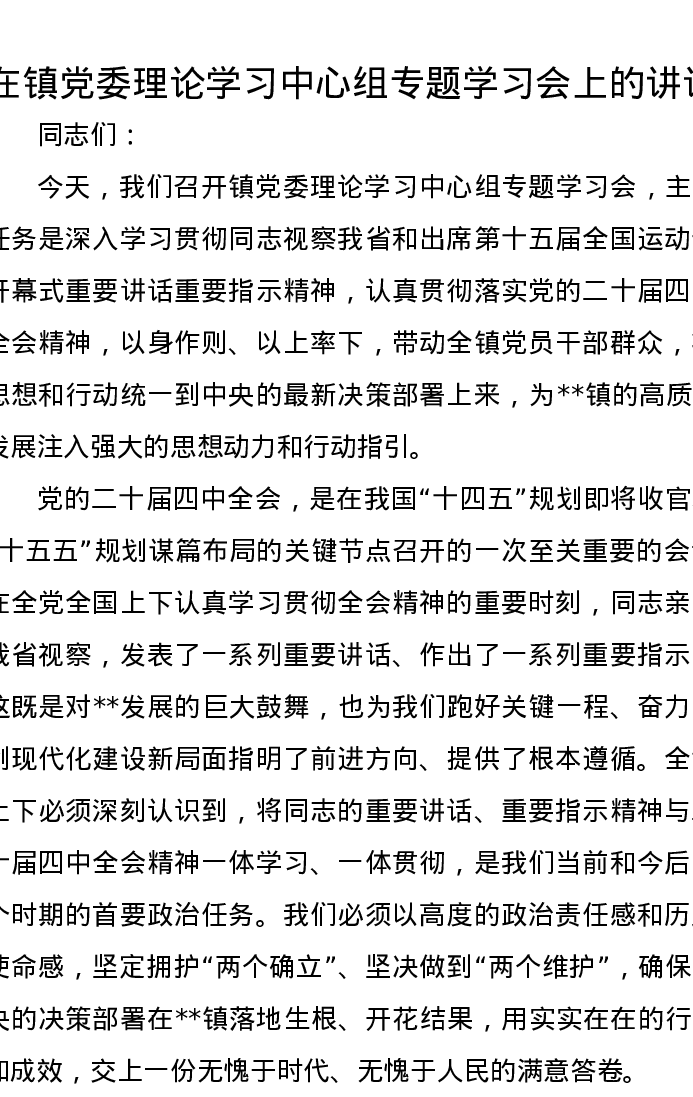在镇党委理论学习中心组专题学习会上的讲话