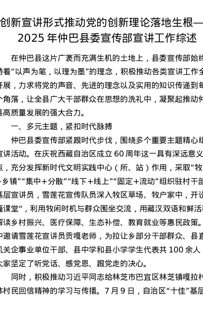 创新宣讲形式 推动党的创新理论落地生根——2025年仲巴县委宣传部宣讲工作综述