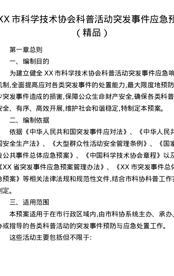XX市科学技术协会科普活动突发事件应急预案