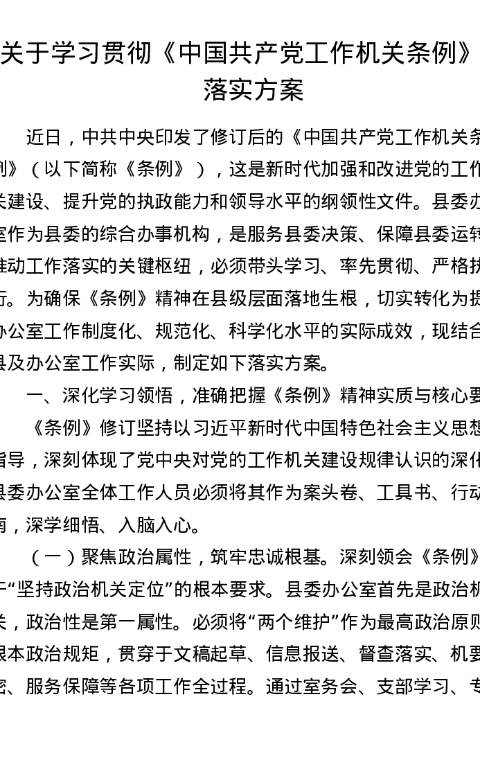关于学习贯彻《中国共产党工作机关条例》的落实方案