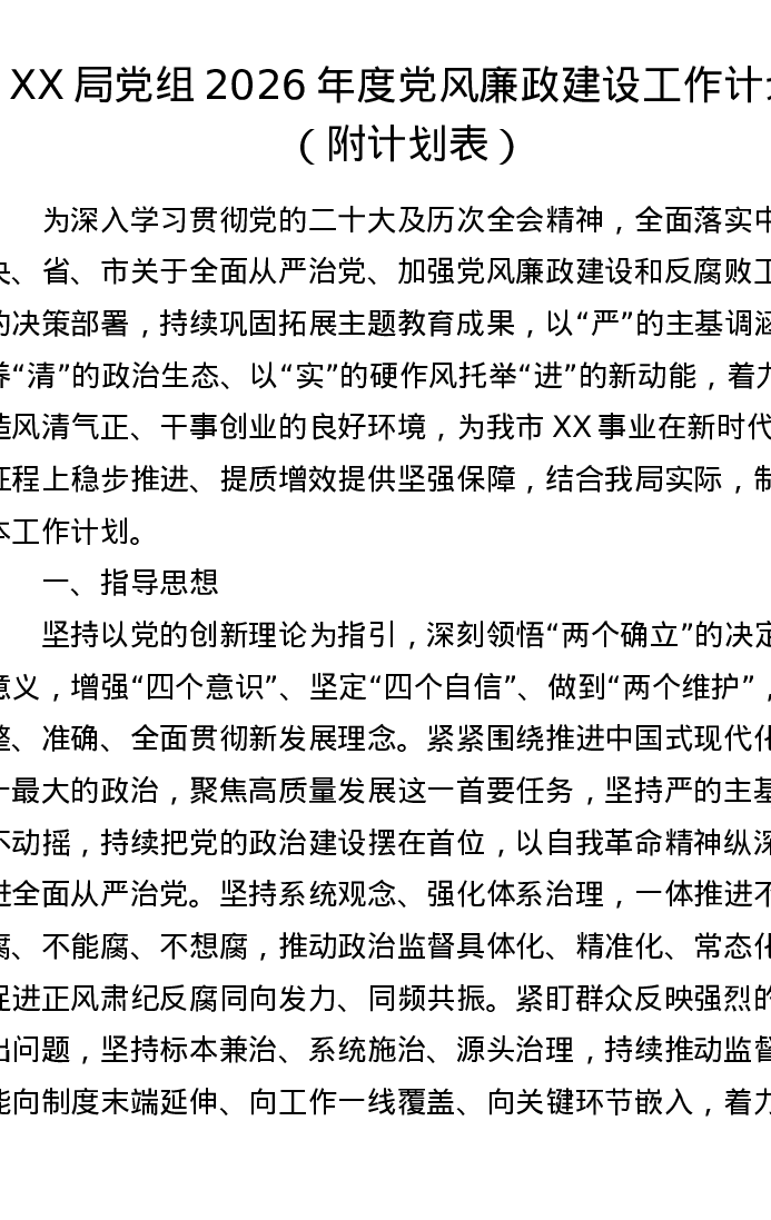 XX局党组2026年度党风廉政建设工作计划(附计划表)
