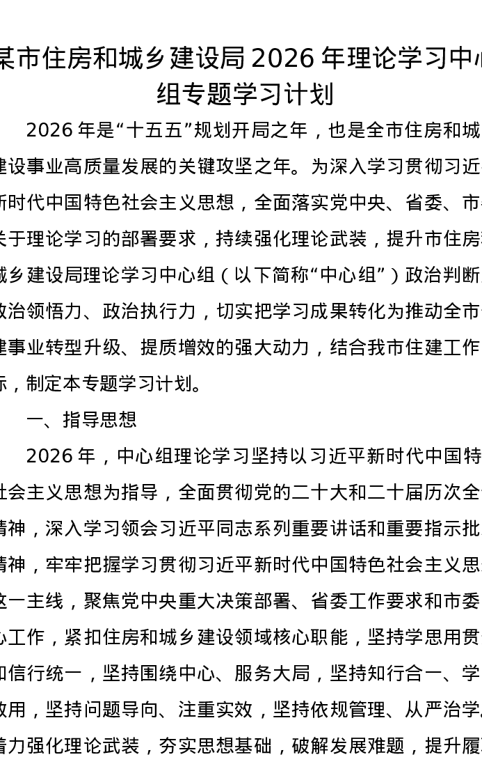某市住房和城乡建设局2026年理论学习中心组专题学习计划