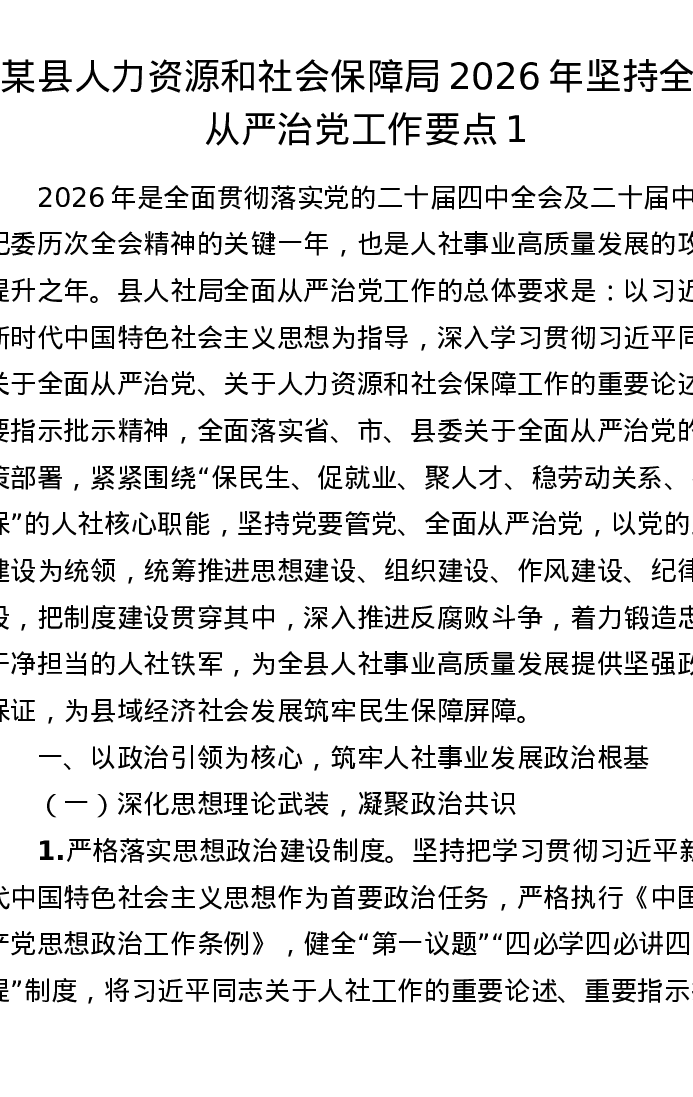 某县人力资源和社会保障局2026年坚持全面从严治党工作要点1