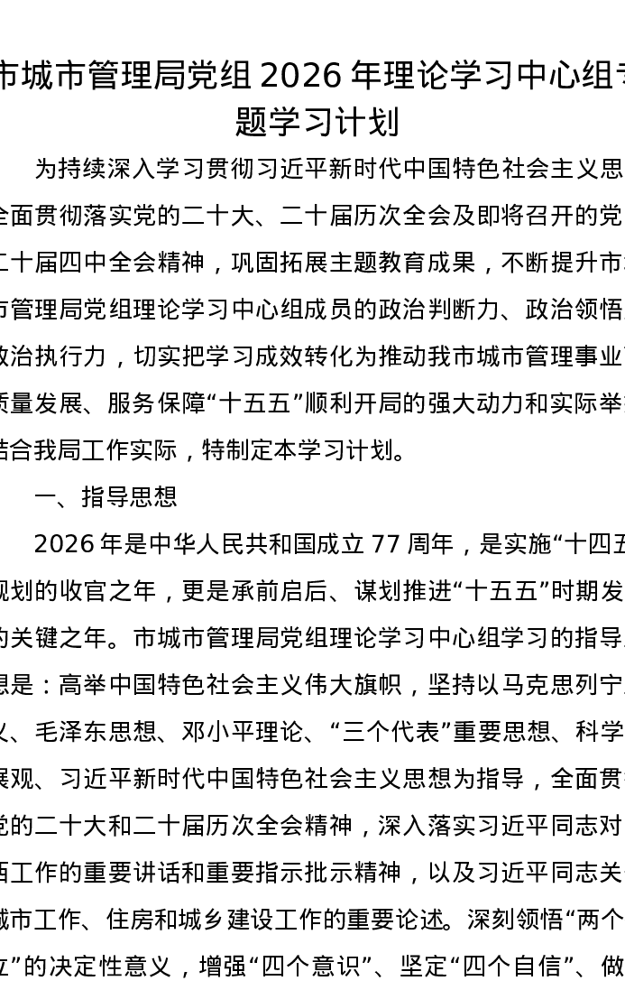 市城市管理局党组2026年理论学习中心组专题学习计划