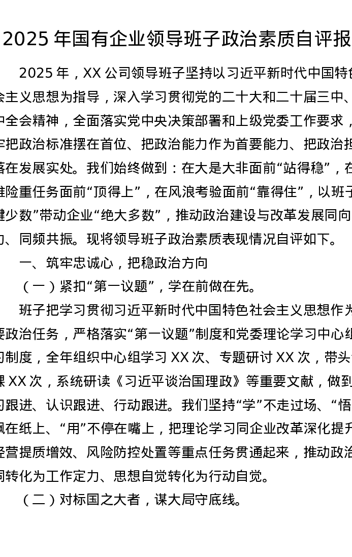2025年国有企业领导班子政治素质自评报告