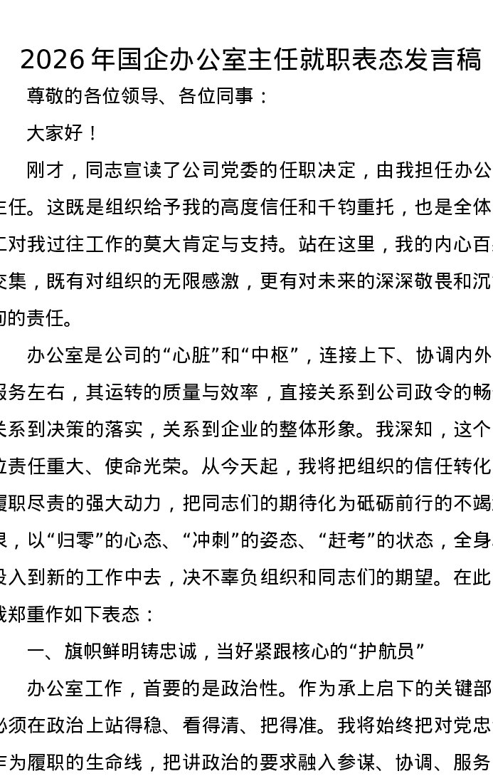 2026年国企办公室主任就职表态发言稿