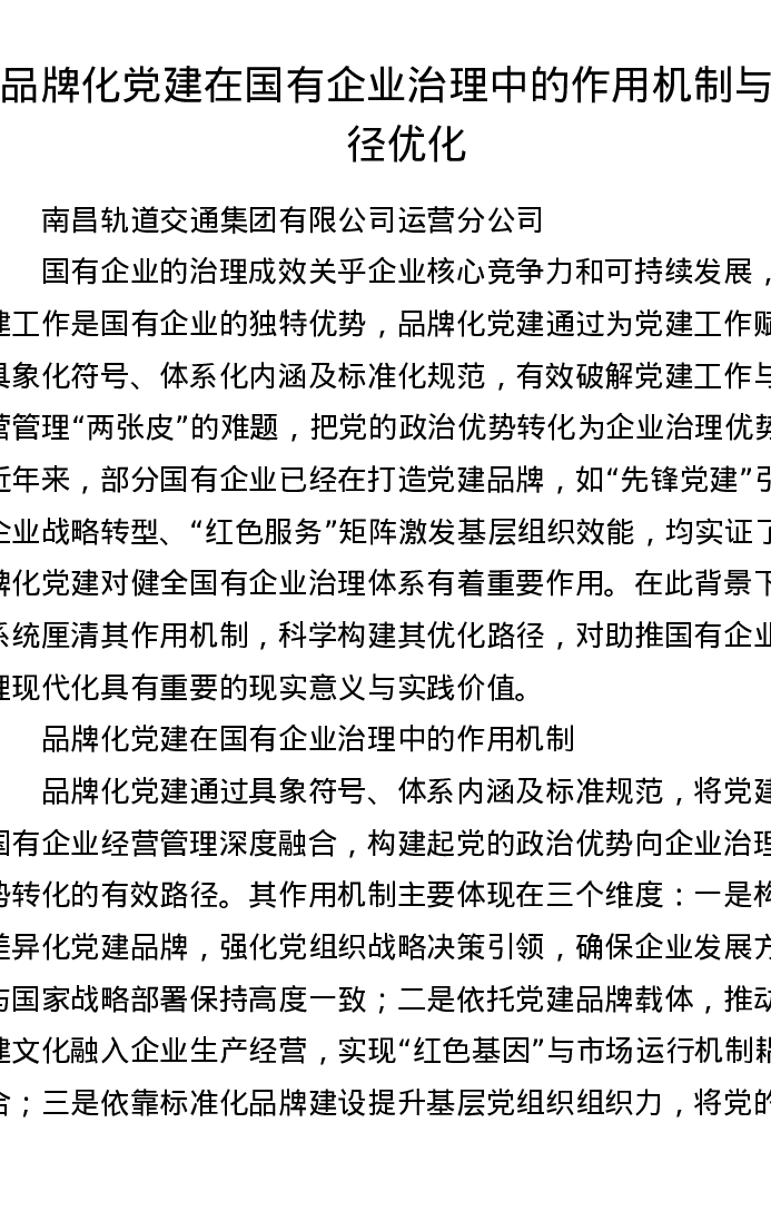 调研报告:品牌化党建在国有企业治理中的作用机制与路径优化