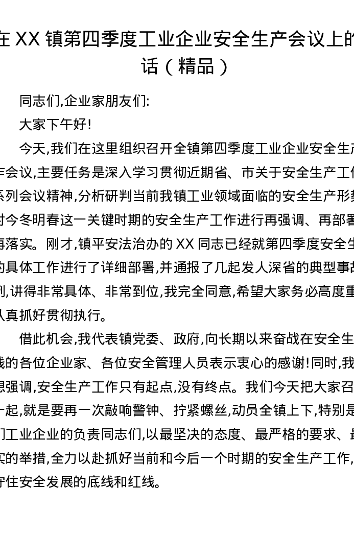 在XX镇第四季度工业企业安全生产会议上的讲话