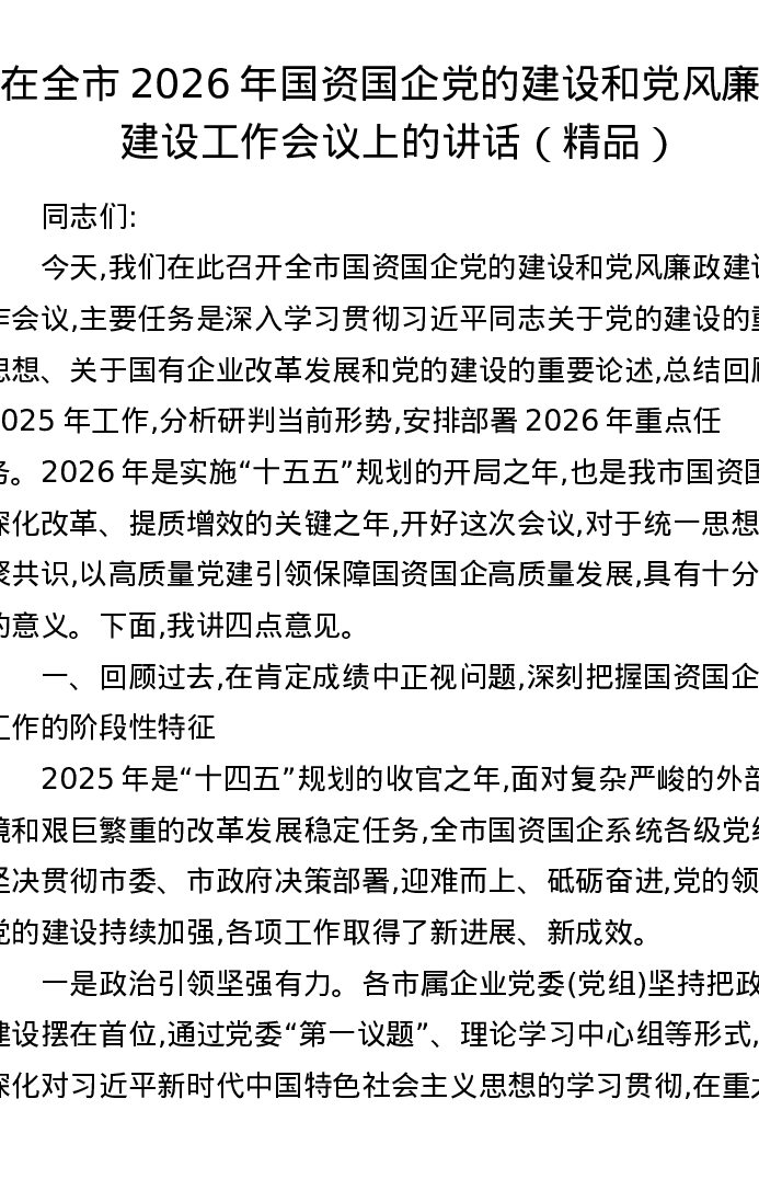 在全市2026年国资国企党的建设和党风廉政建设工作会议上的讲话