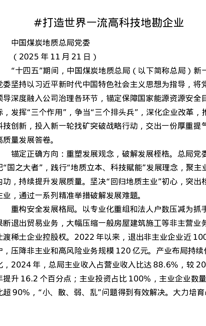 中心组讲话:打造世界一流高科技地勘企业