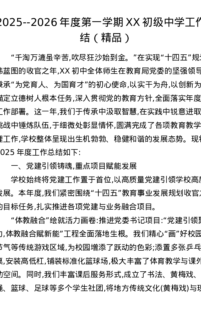 2025--2026年度第一学期XX初级中学工作总结
