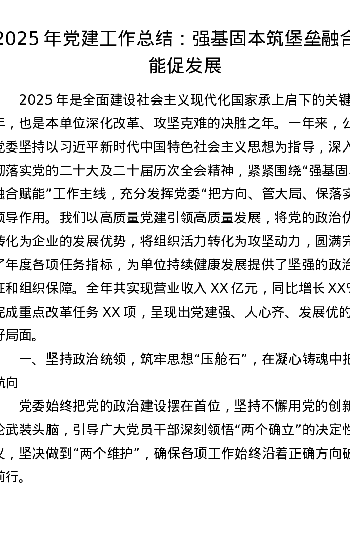2025年党建工作总结:强基固本筑堡垒 融合赋能促发展