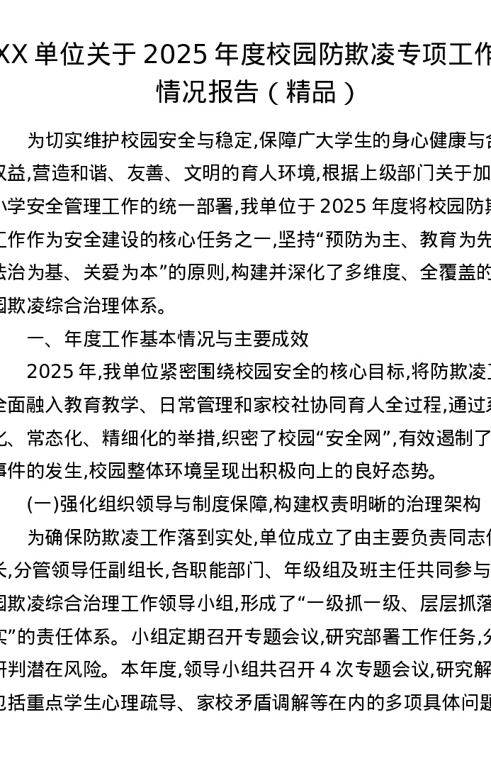 XX单位关于2025年度校园防欺凌专项工作的情况报告