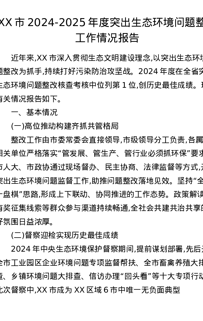 XX市2024-2025年度突出生态环境问题整改工作情况报告