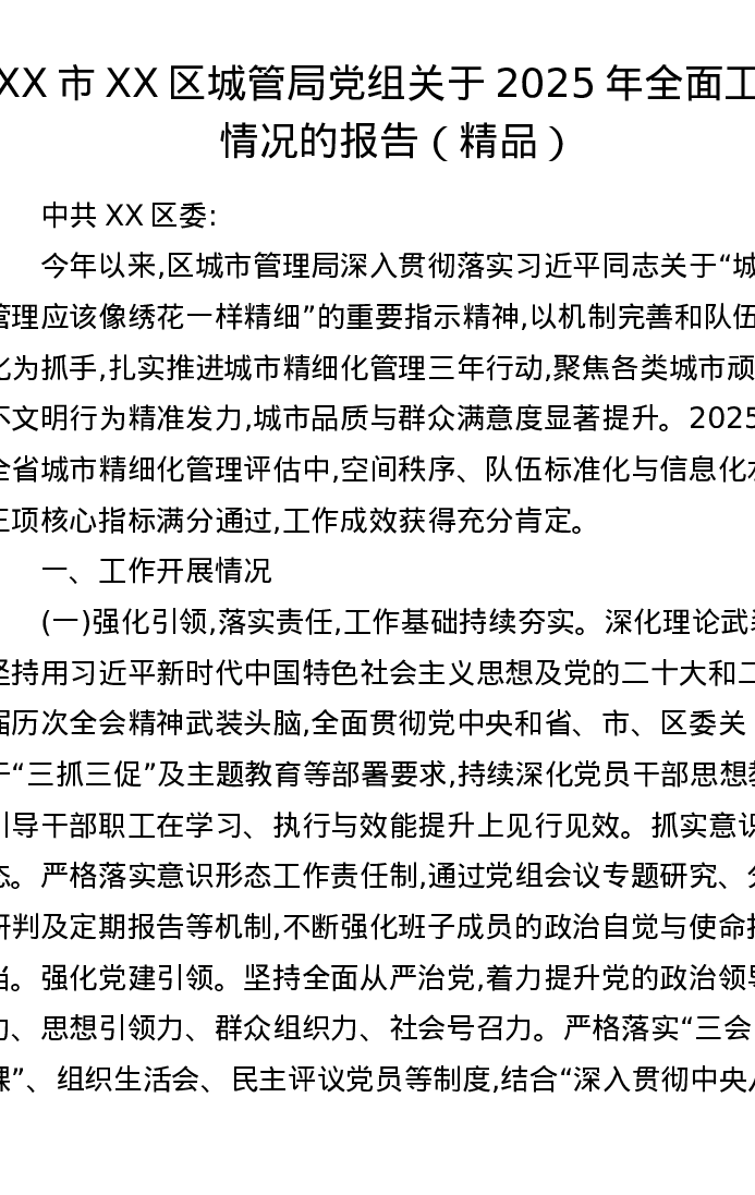 XX市XX区城管局党组关于2025年全面工作情况的报告