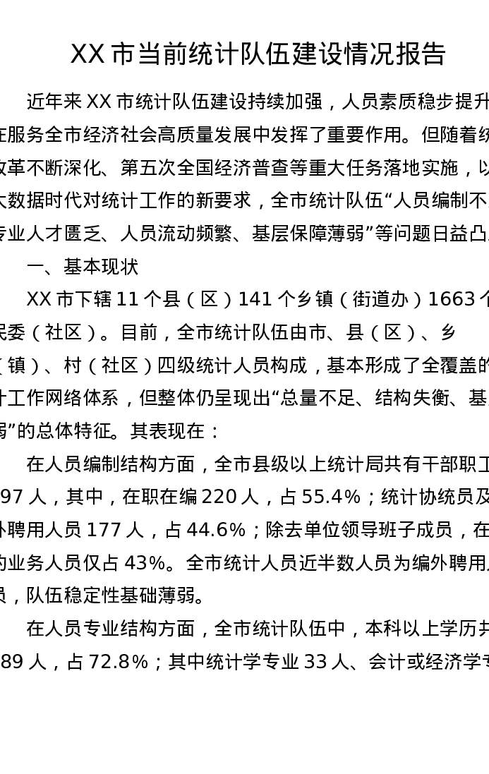 XX市当前统计队伍建设情况报告