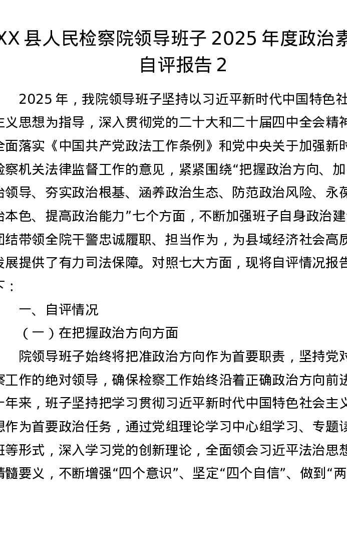 XX县人民检察院领导班子2025年度政治素质自评报告2