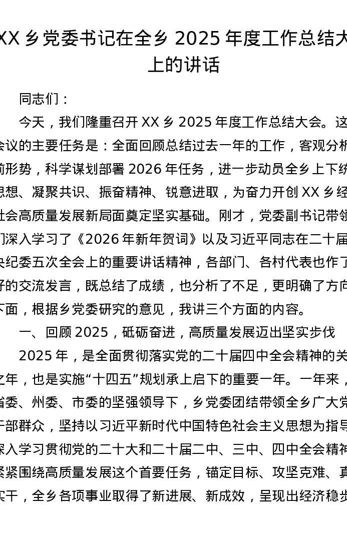 XX乡党委书记在全乡2025年度工作总结大会上的讲话