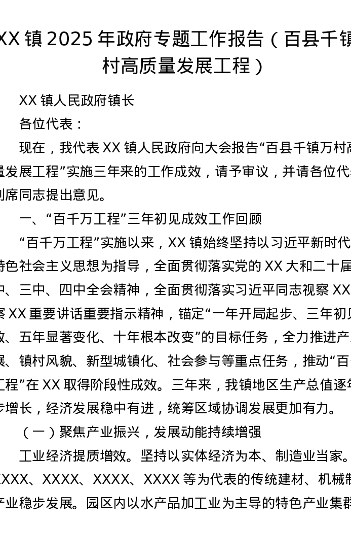 XX镇2025年政府专题工作报告(百县千镇万村高质量发展工程)