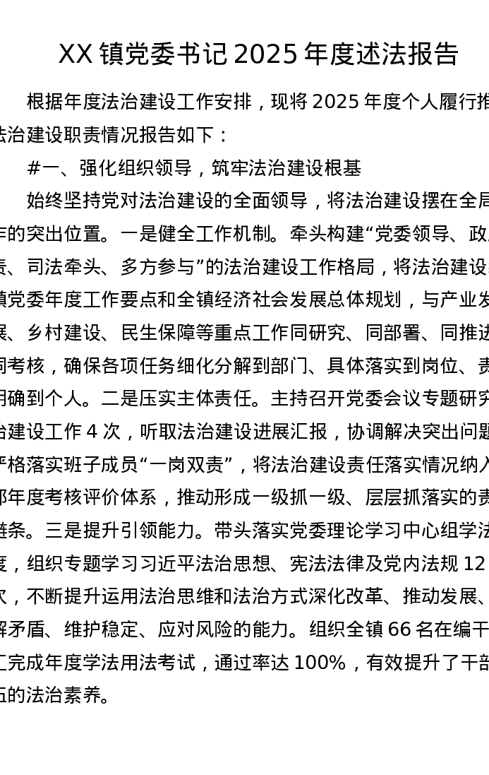 XX镇党委书记2025年度述法报告(2176字)