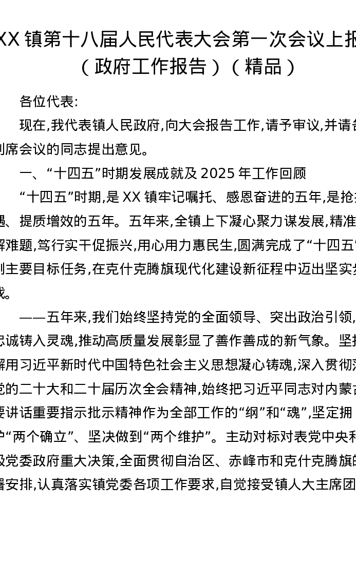 XX镇第十八届人民代表大会第一次会议上报告(政府工作报告)