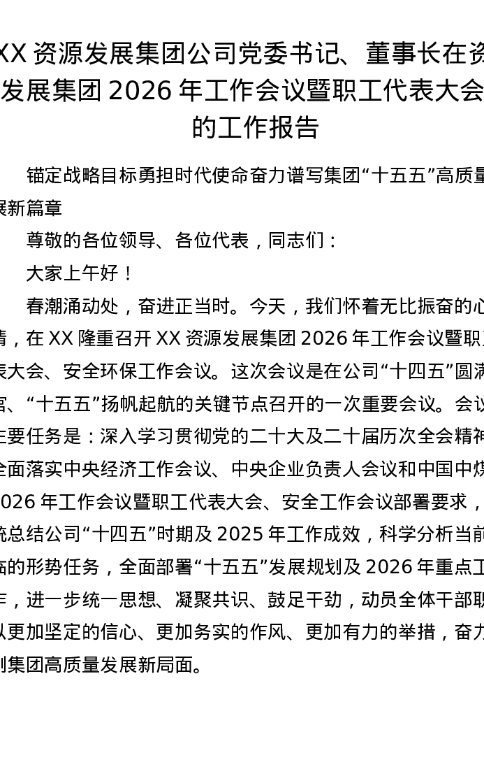 XX资源发展集团公司党委书记、董事长在资源发展集团2026年工作会议暨职工代表大会上的工作报告