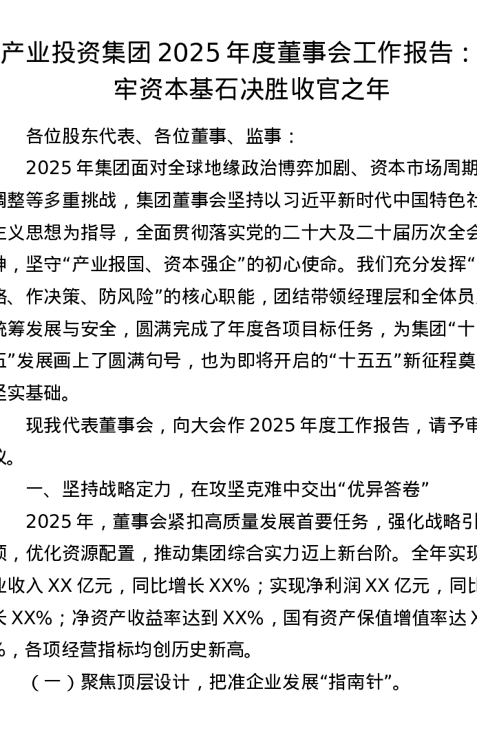 产业投资集团2025年度董事会工作报告:筑牢资本基石 决胜收官之年