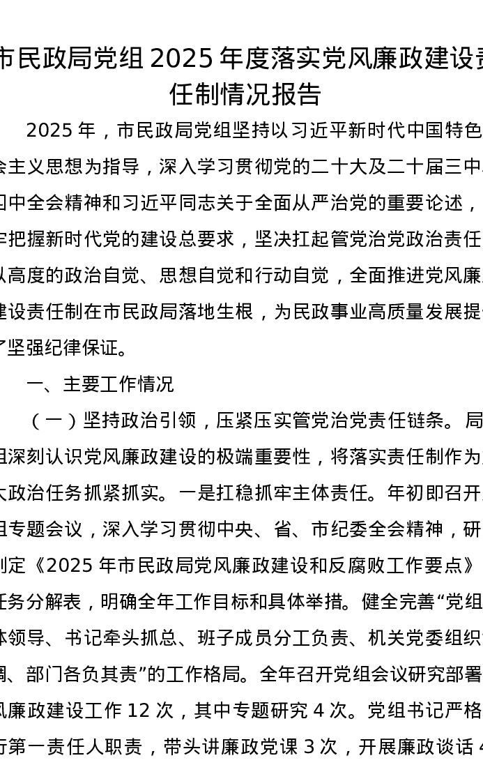 市民政局党组2025年度落实党风廉政建设责任制情况报告