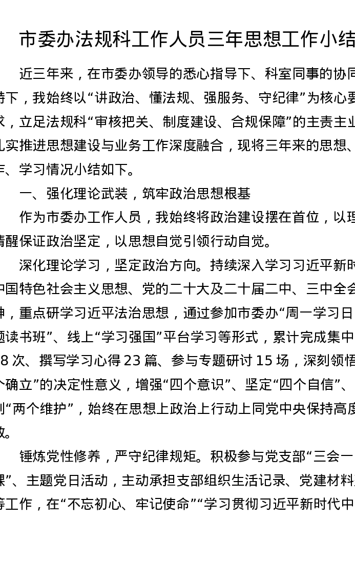 市委办法规科工作人员三年思想工作小结