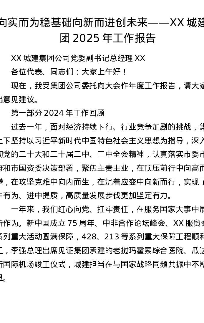 向实而为稳基础 向新而进创未来——XX城建集团2025年工作报告