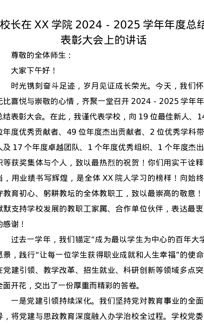校长在XX学院2024-2025学年年度总结表彰大会上的讲话