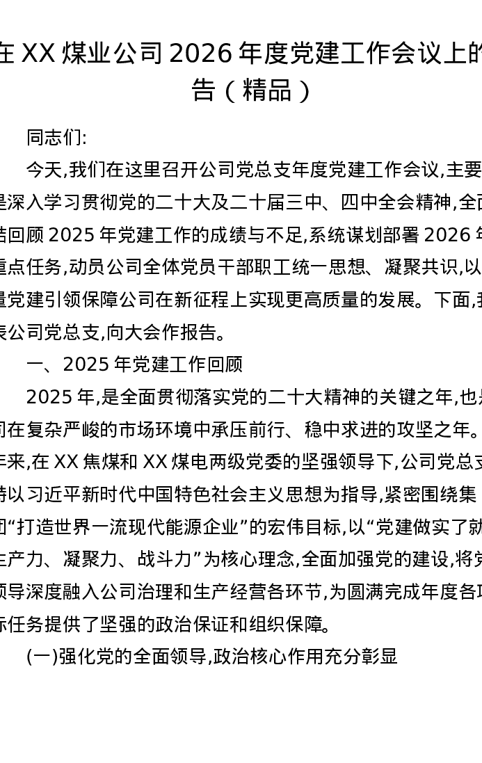 在XX煤业公司2026年度党建工作会议上的报告