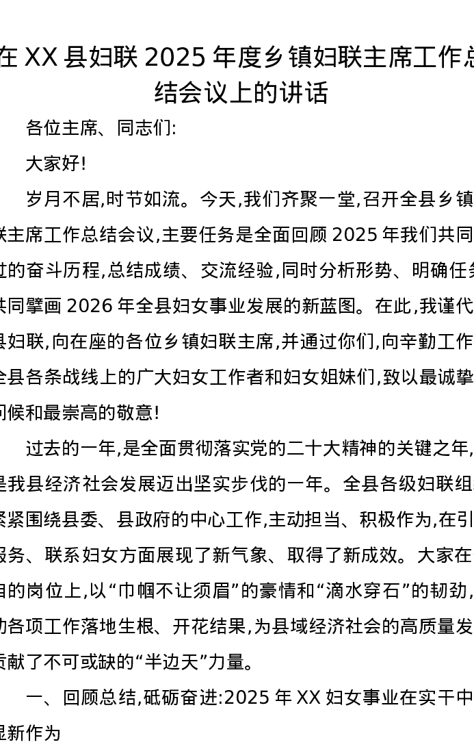 在XX县妇联2025年度乡镇妇联主席工作总结会议上的讲话