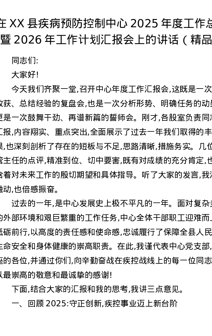 在XX县疾病预防控制中心2025年度工作总结暨2026年工作计划汇报会上的讲话