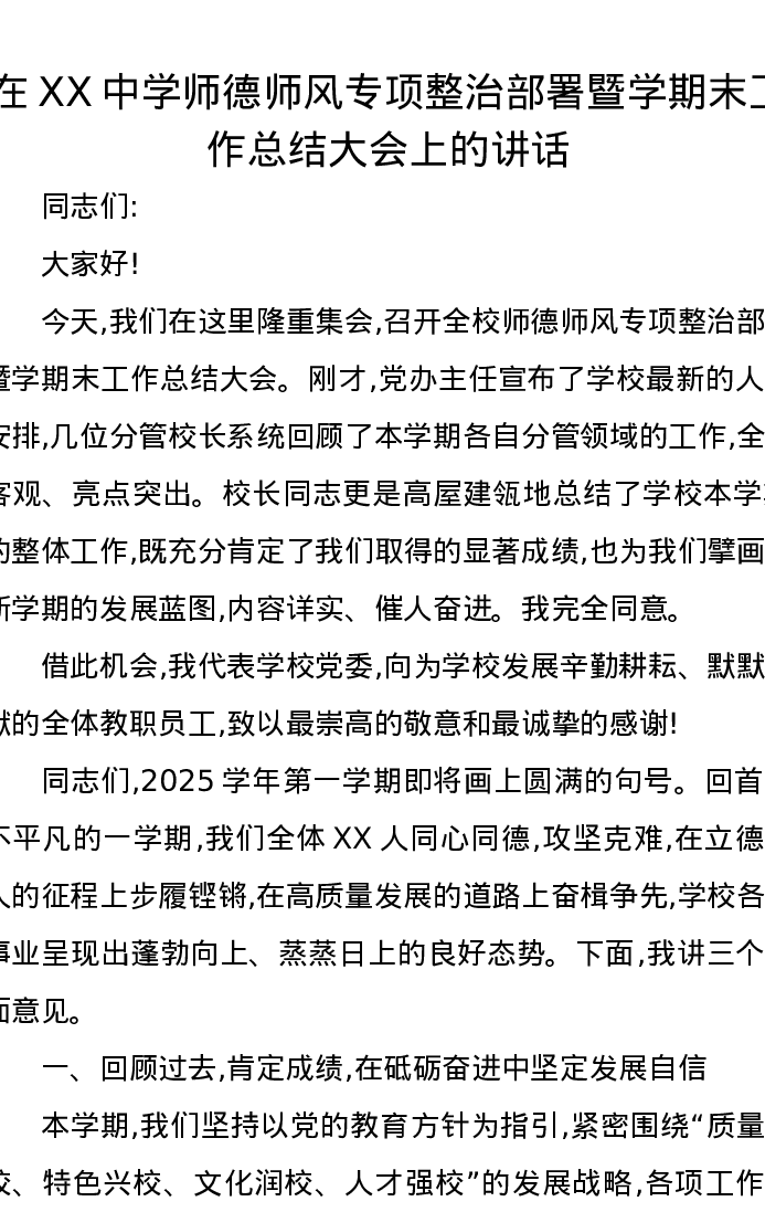 在XX中学师德师风专项整治部署暨学期末工作总结大会上的讲话