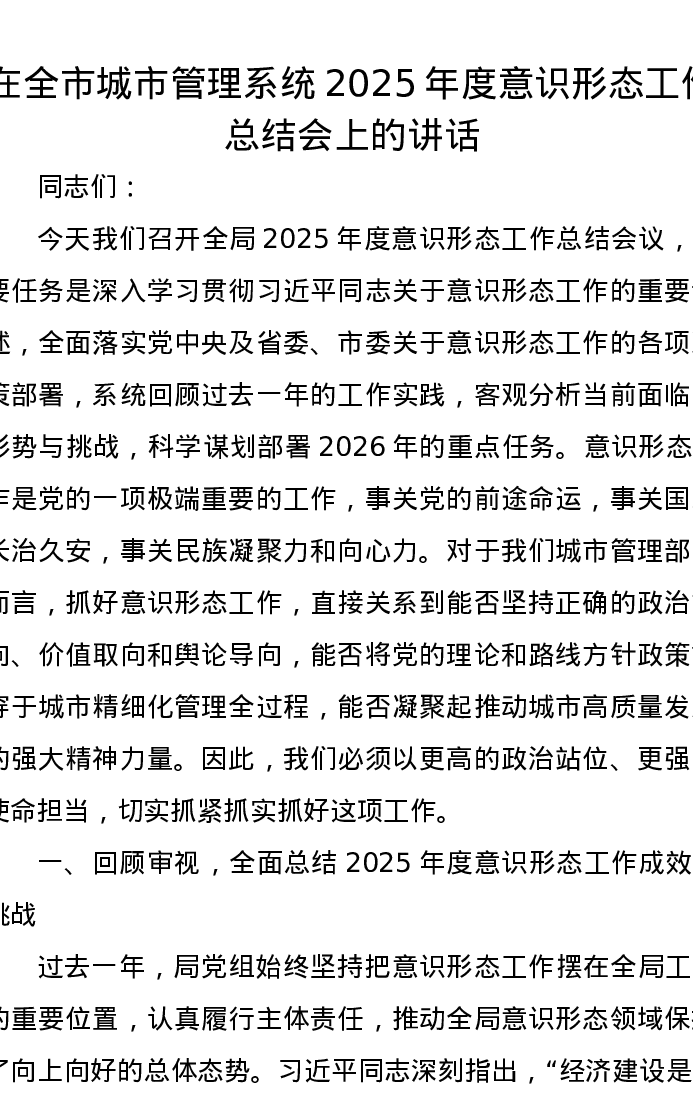 在全市城市管理系统2025年度意识形态工作总结会上的讲话