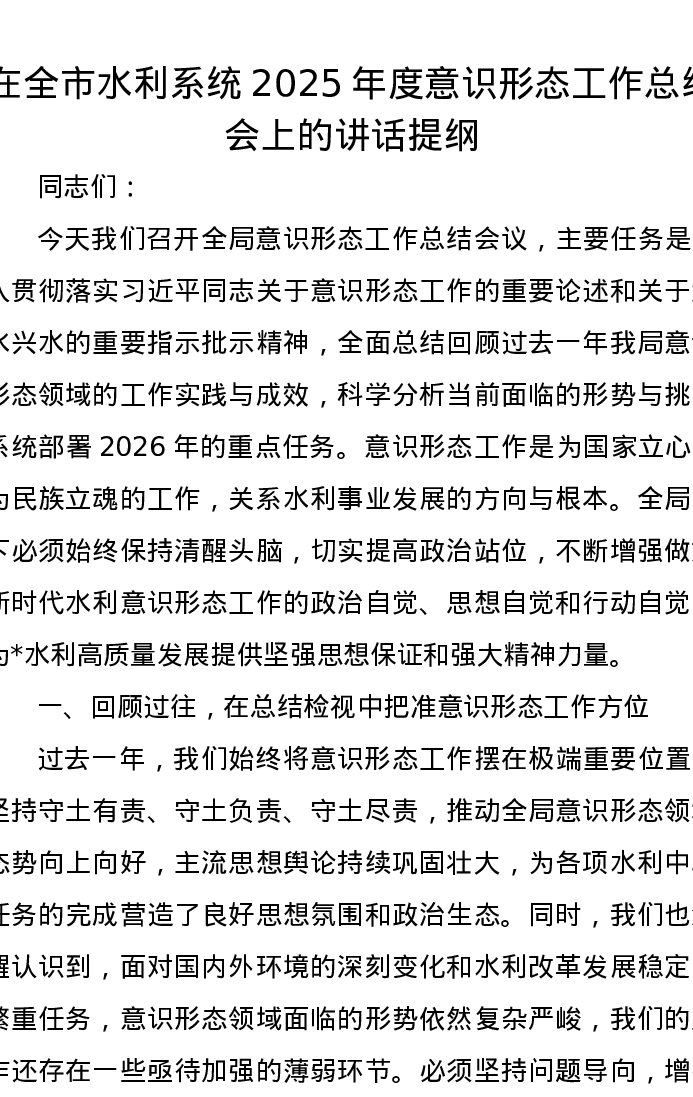 在全市水利系统2025年度意识形态工作总结会上的讲话提纲