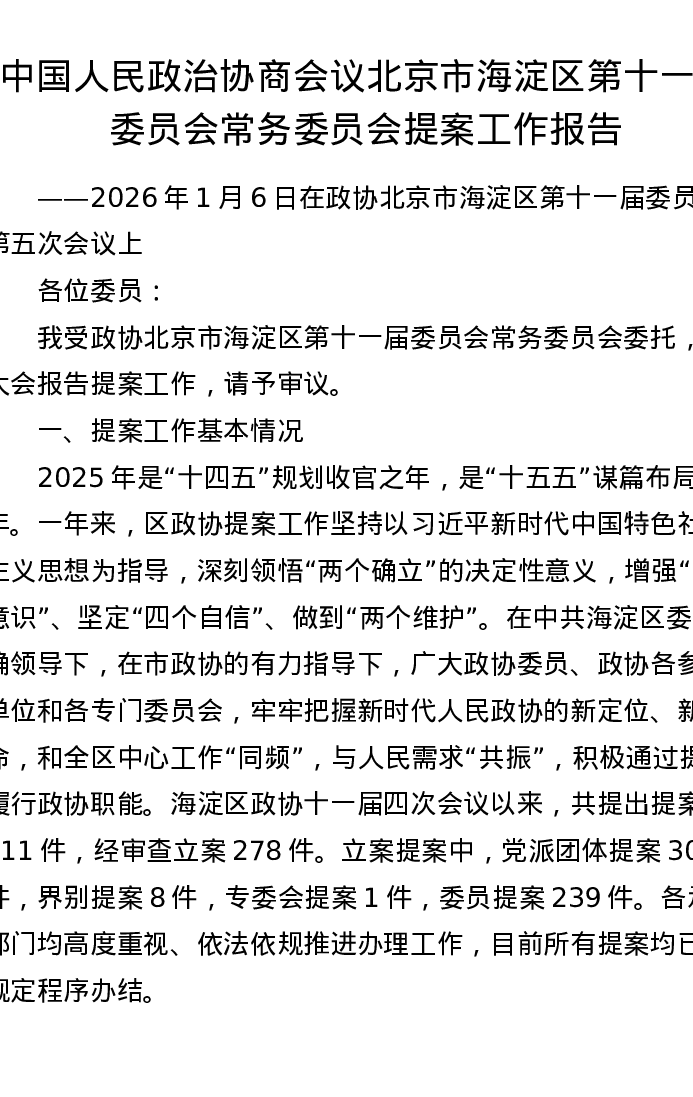 中国人民政治协商会议北京市海淀区第十一届委员会常务委员会提案工作报告