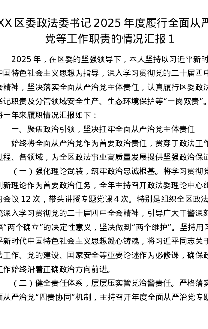 XX区委政法委书记2025年度履行全面从严治党等工作职责的情况汇报1