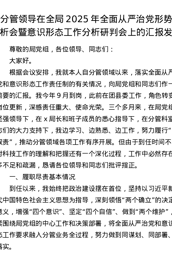 分管领导在全局2025年全面从严治党形势分析会暨意识形态工作分析研判会上的汇报发言