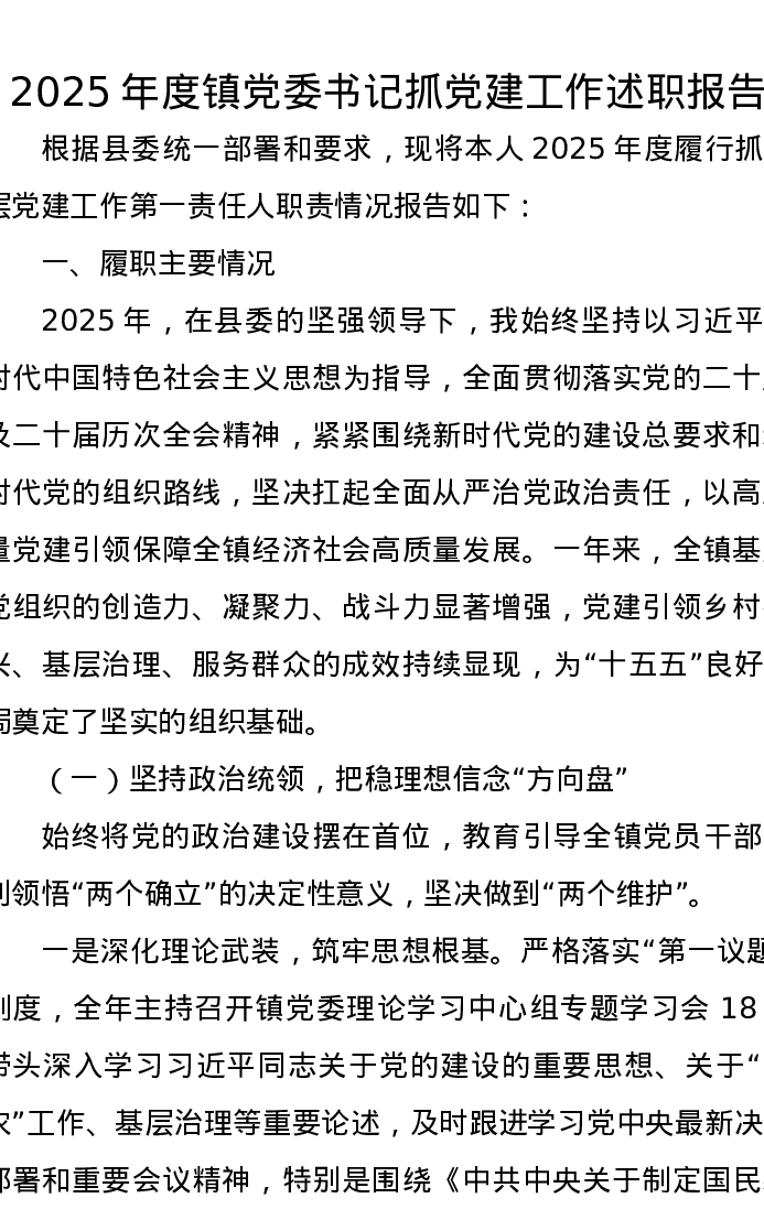 2025年度镇党委书记抓党建工作述职报告