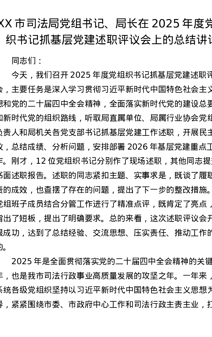 XX市司法局党组书记、局长在2025年度党组织书记抓基层党建述职评议会上的总结讲话