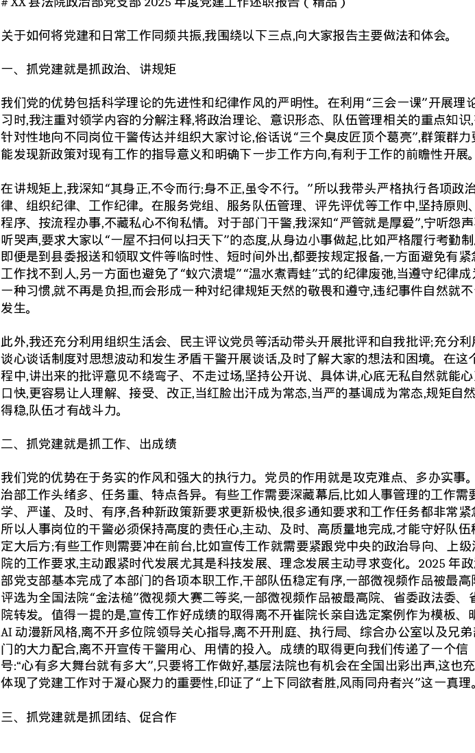 XX县法院政治部党支部2025年度党建工作述职报告