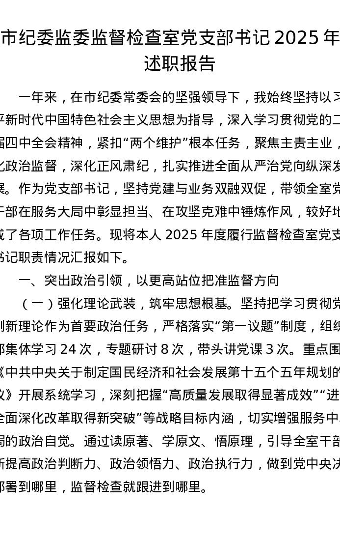 市纪委监委监督检查室党支部书记2025年度述职报告