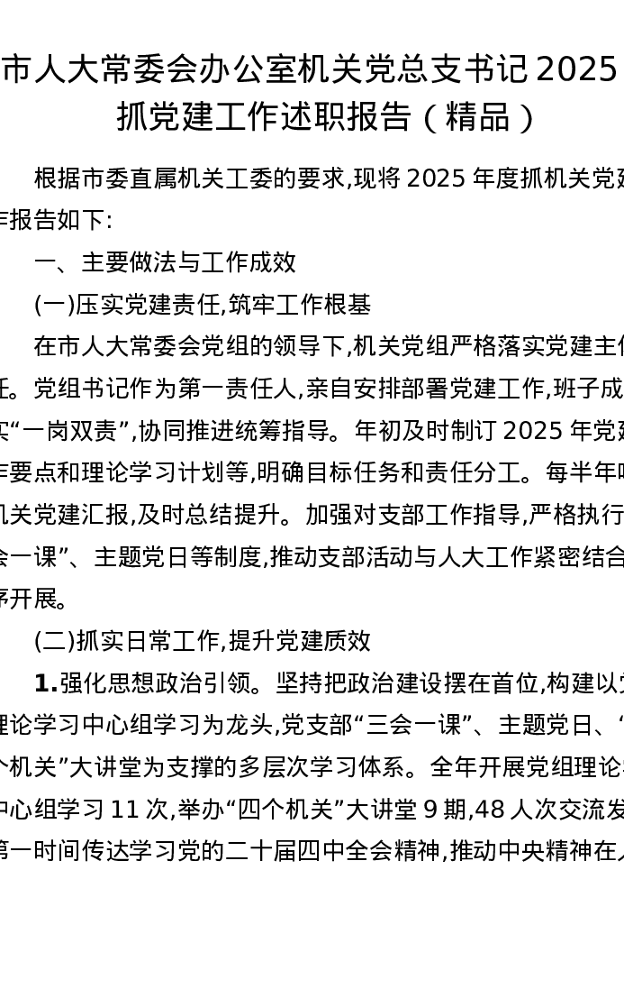 市人大常委会办公室机关党总支书记2025年抓党建工作述职报告