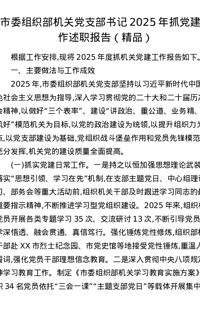 市委组织部机关党支部书记2025年抓党建工作述职报告