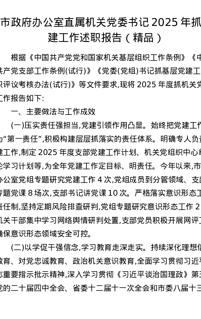 市政府办公室直属机关党委书记2025年抓党建工作述职报告