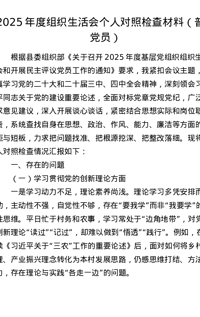 (普通党员)2025年度组织xxx个人对照检查材料