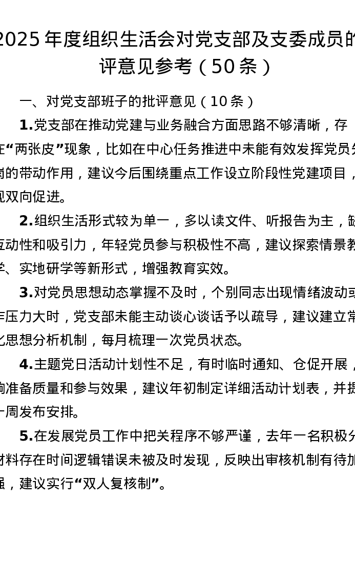 2025年度组织xxx对党支部及支委成员的批评意见参考(50条)