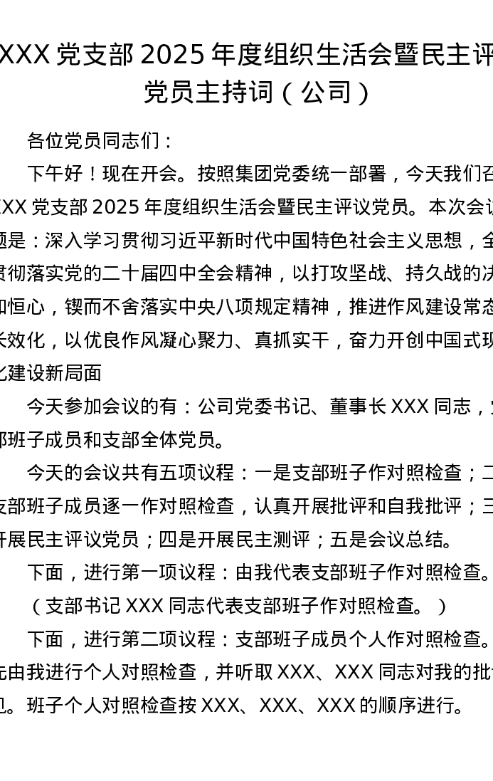 XXXX党支部2025年度组织xxx暨民主评议党员主持词(公司)